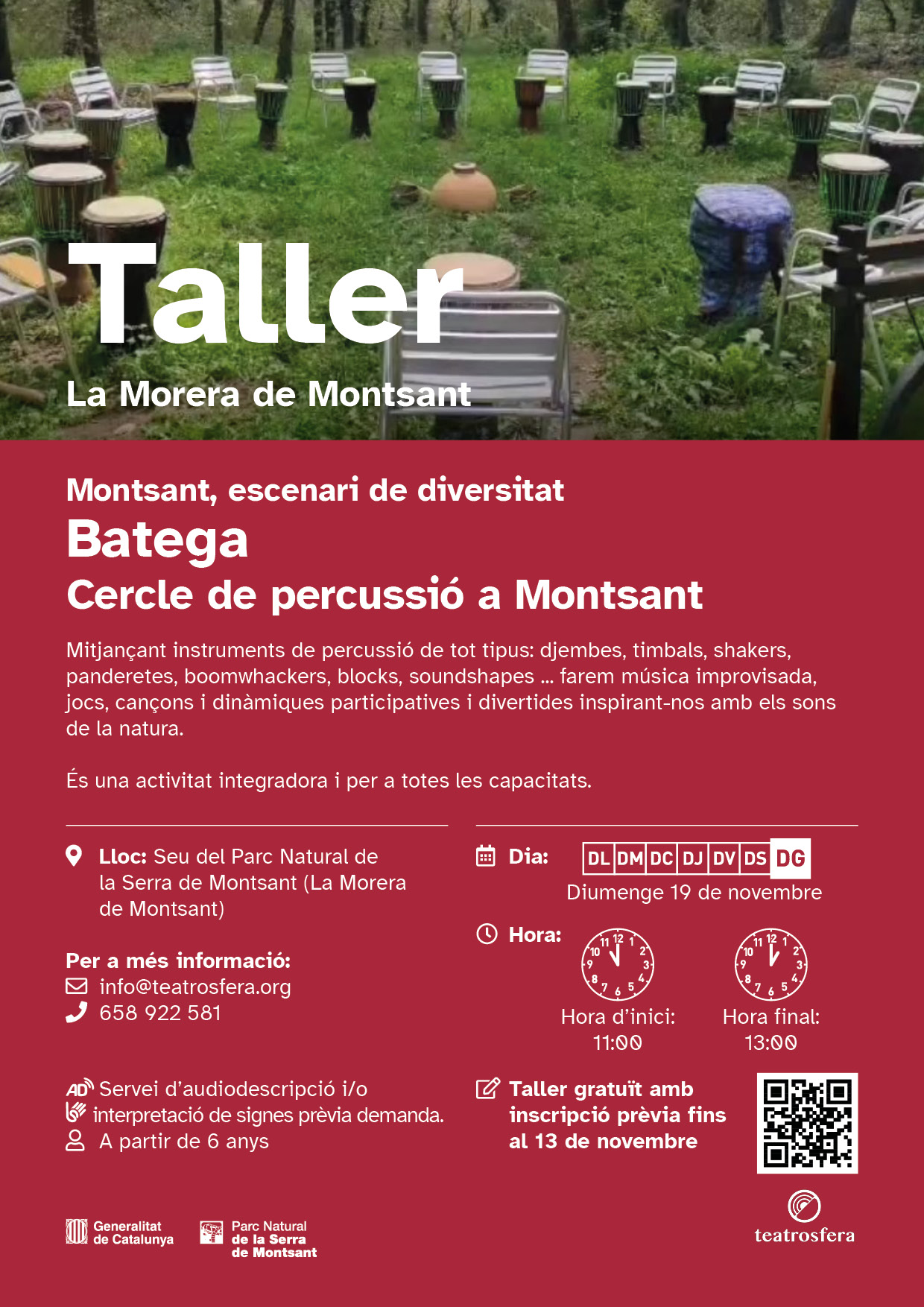 Mitjançant instruments de percussió de tot tipus farem música improvisada, jocs, cançons i dinàmiques participatives i divertides inspirant-nos amb els sons de la natura.